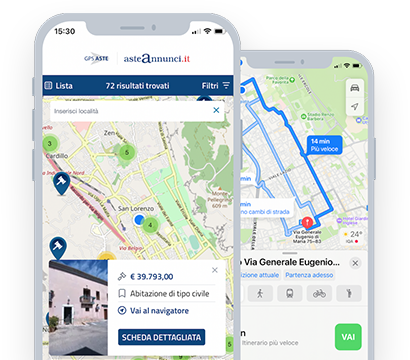 GPS Aste è la prima applicazione che localizza immobili in asta direttamente sulla mappa, attiva il navigatore e lasciati guidare sino all'immobile di tuo interesse.